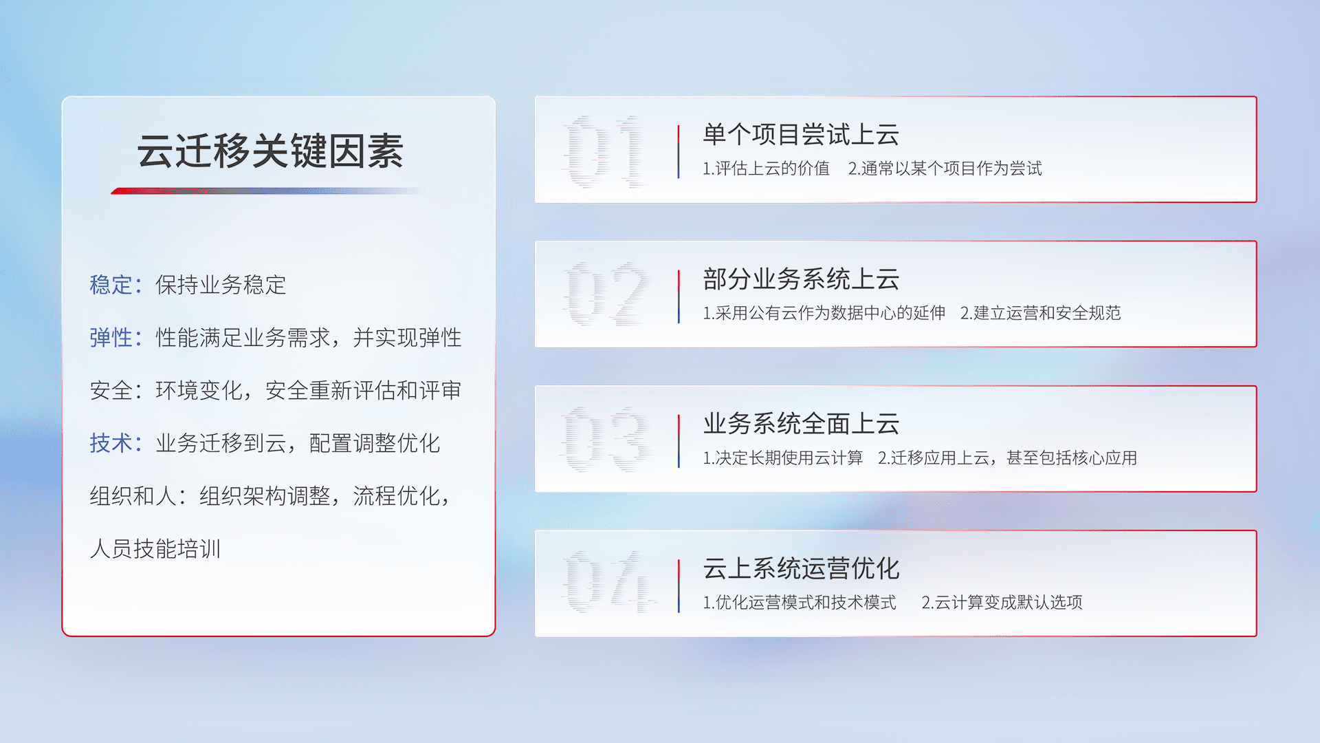 结合实际业务,,,从规划设计、、、、云平台选型、、云原生改造、、数据迁移、、集成交付,,,迁移全过程为客户识别最佳上云路径,,做好风险识别管理,,设计网络架构、、、、身份权限、、、安全审计合规、、操作审计、、、日志审计、、、、监控告警策略、、多站点容灾设计等,,,对云上基础设施进行整体规划,,提升IT治理水平,,以满足弹性、、、、高可用、、高性能的需求。。。