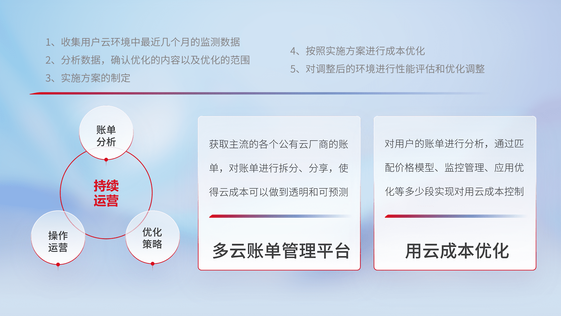 通过多云纳管,,,以统一的资源数据模型把客户的云资源进行抽象和封装,,进而实现对多云资源的统一操作,,,保障云资源管理的可靠性、、、稳定性与可用性。。。。量身定制化运维内容,,,,配置、、、、开发运维、、、补丁管理、、备份、、、、监控、、认证和访问管理、、、审计和日常巡检等,,,,保障在用云过程中的可靠度,,,,稳定度以及高可用率。。。